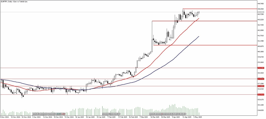 EURTRY paritesinde bugün yukarı yönlü bir eğilim izliyoruz. Paritede 44.00 seviyesinin üzerinde kalıcılık sağlanması halinde 44.26 zirvesi tekrar test edilebilir. Olası geri çekilmelerde ise 43.70 seviyesi yakın destek olarak takip edilebilir.