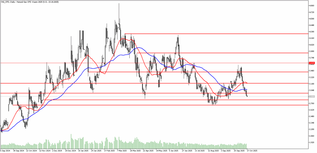 Doğalgaz CFD’si yatırımcıların EIA raporuna tepki göstermesiyle yeni dip seviyeleri test ediyor. Rapor, depolama alanındaki çalışma gazının bir önceki haftaya göre +80 milyar fit küp arttığını gösteriyor. Beklenenden daha büyük bir stok artışı gösteren veriler baskı oluştururken 3,05 direncinden teknik olarak uzaklaşmaya devam ediyor. Doğal Gaz CFD’sinde teknik açıdan ilk destek olan 2,86 seviyesine doğru ilerliyor. Tekrar 2,97 seviyesi üzerinde bir tutunma olmaması halinde zayıf teknik görünüm sürecektir. Bununla birlikte satışların 2,86 seviyesi üzerinde kalmakta başarılı olamaması halinde 2,73 seviyesine doğru gevşeme eğilimi bulunabilir.