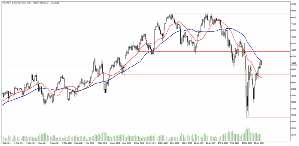 Teknik Analiz: Dow Jones CFD endeksi 50 günlük hareketli ortalama direncini aşmayı başaramadı. Endekste 50 günlük hareketli ortalamanın bulunduğu 41350 seviyesini direnç olarak takip etmeye devam ediyoruz. Bu direncin aşılması ve üzerinde kalıcılık sağlanması halinde endekste yukarı yönde 42000 seviyesi test edilebilir. Aşağı yönde ise 40700 ve 40400 seviyeleri endekste destek olarak takip edilebilir