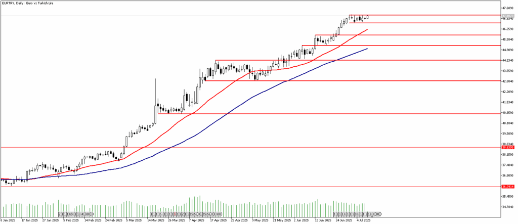 EURTRY paritesinde 46.67 – 47.18 seviyeleri arasında bulunan yatay banttaki fiyatlama devam ediyor. Paritedeki yatay eğilimin son bulması ve 47.18 direncinin aşılması halinde yukarı yönde 47.25 ve 47.40 seviyeleri direnç olarak karşımıza çıkabilir. 46.67 desteğinin aşağı yönde kırılması durumunda ise 46.15 seviyesine kadar düzeltme yaşanabilir.