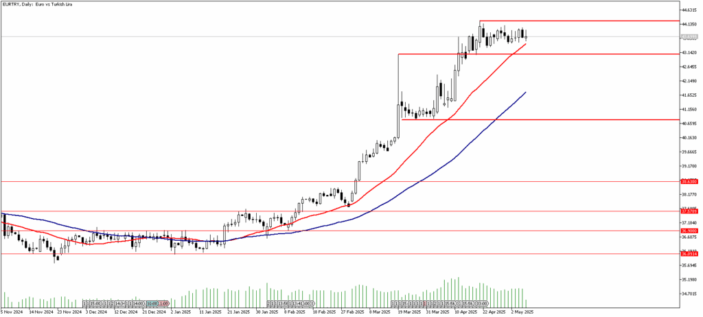 EURTRY paritesinde 44.00 seviyesi direnç olmaya devam ediyor. Paritede 44.00 seviyesinin üzerinde gün sonu kapanışları gelmesi halinde 44.26 zirvesi tekrar test edilebilir. Aşağı yönde ise 22 günlük hareketli ortalamanın bulunduğu 43.45 seviyesi destek olarak takip edilebilir.
