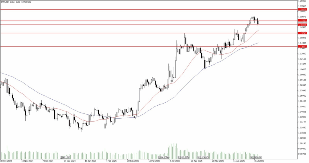 EURUSD paritesinde geri çekilme yaşandı. Dün ABD Başkanı Trump, 9 Temmuz’da sona eren tarife erteleme süresinin 1 Ağustos’a uzatılmasına ilişkin kararnameyi imzaladı. Öte yandan Japonya ile Güney Kore’ye gönderdiği “tarife mektuplarında” bu ülkelerden 1 Ağustos’tan itibaren ABD’ye gönderilen tüm ürünlere, sektörel tarifelerden ayrı olarak yüzde 25 gümrük vergisi uygulanacağını bildirdi. Bu kararlardan sonra dolar endeksinde güçlenme eğilimi görüldü. DXY 97,35 seviyelerinde fiyatlamaya devam ediyor. Veri tarafında dün euro bölgesi sentix yatırımcı güveni beklentilerin çok üzerinde 4,5 olarak açıklandı. Perakende satışlar ise yıllıkta 1,8% seviyesine yükseldi. Bugün ABD NFIB Küçük İşletme İyimserlik Endeksi takip edilecek. Bugün sakin bir seans günü geçmesini bekliyoruz.