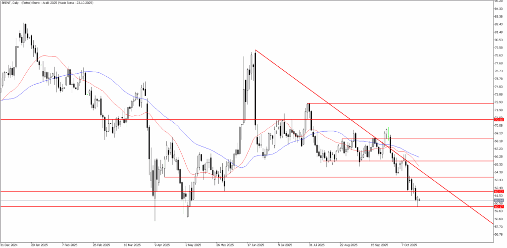 Petrol’de aşağı yönlü eğilim sürüyor. Orta Doğu’da atılan barış adımları, Putin ile Trump’ın Rusya- Ukrayna savaşının akıbeti hakkında görüşecek olması, Çin-ABD tarifeleri, tüm bunlar petrol’de aşağı yönlü etkiye neden oluyor. Bu hafta petrol talebi açısından Çin ABD görüşmesi kritik olacak. Diğer yandan küresel risk iştahıda belirleyici unsur olacaktır. Teknik açıdan ise Brent petrol’de kritik 60.00 seviyesinden tepki geldi. Bu seviyeyi destek bölgesi olarak izlemeye devam edeceğiz. Olası tepki alımlarında 62.00 direnç olarak karşımıza çıkıyor.