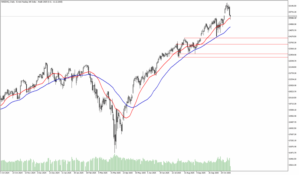 Nasdaq endeksindeki düşüş devam ediyor; bunun başlıca sebebi son haftalarda teknoloji ve yapay zeka odaklı hisselerde artan aşırı değerleme endişesi ile birlikte yatırımcıların güçlü bir piyasa düzeltmesi beklentisine girmesi oldu. Özellikle ABD piyasalarında teknoloji hisseleri öncülüğünde başlayan satış baskısı, Palantir, Tesla ve AMD gibi büyük isimlerin bilançolarının ardından hız kazandı. Goldman Sachs ve Morgan Stanley gibi büyük bankalardan gelen “piyasa düzeltmesi olası” uyarıları da bu kar satışlarını destekledi. Öte yandan, son dönemde yapay zeka ve yarı iletken hisselerinde yaşanan sert yükselişlerin ardından “balonlaşma” endişeleri artarken, birçok yatırımcı bu hisselerin kazançlarını realize etmeye yöneldi. Teknik olarak endekste aşağı yönlü trend devam ediyor. Endeks 22 günlük hareketli ortalamasının bulunduğu 25382 seviyesini test etti ancak altında kalıcı olmadı. Aşağı yönlü baskının artması durumunda 50 günlük hareketli ortalamanın bulunduğu 24800 seviyesi destek olarak izlenebilir. Buna karşı yukarı yönlü hareketliliğin artması durumunda 26280 seviyesi direnç olarak takip edilebilir.