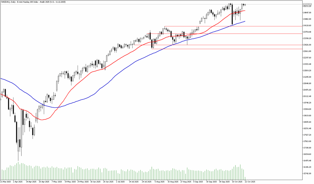 Nasdaq CFD’si, açıklanmaya başlanan üçüncü çeyrek bilançoların genel olarak beklentilerin üzerinde gelmesiyle birlikte yükseliş eğilimine girdi. Özellikle teknoloji devlerinin güçlü finansal sonuçları ve yapay zekâ temalı yatırımların sürmesi, endekste risk iştahını artırdı. Piyasalarda genel hava, “ABD ekonomisi yeterince iyi durumda” algısı üzerine kurulmuş durumda. Büyük yatırım kuruluşları, özellikle BlackRock gibi fonların analizlerinde, faiz indirimlerinin 2026 yılına sarkabileceği ancak ekonomik aktivitenin dirençli kalmasının hisse senetlerine destek sağlayabileceği vurgulanıyor.