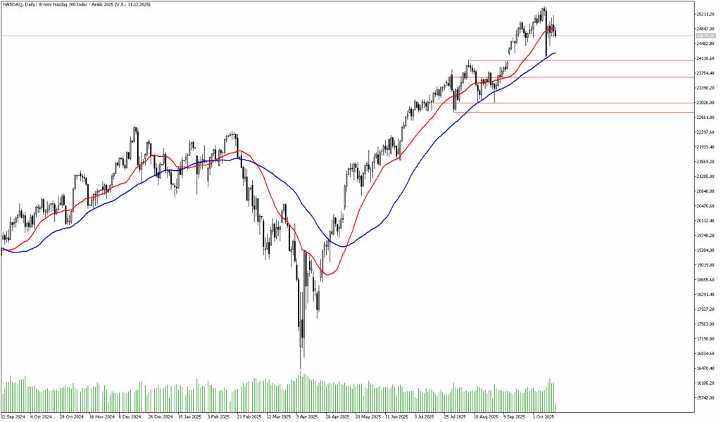 Sonuç olarak hem finansal hem politik cepheden gelen baskılar, bugün Nasdaq’ta görülen satış dalgasını tetikleyen ana unsurlar. Nasdaq’ta teknik olarak bugün aşağı yönlü baskı mevcut. Endeks 22 günlük hareketli ortalamasını test etti ancak üzerine çıkamadı. Aşağı yönlü bu hareketliliğin artması halinde 50 günlük hareketli ortalamanın bulunduğu 24260 seviyesi destek olarak takip edilebilir. Buna karşın olası bir yukarı yönlü toparlanma hareketinde 22 günlük hareketli ortalamanın bulunduğu 24880 seviyesi direnç olarak izlenebilir.
