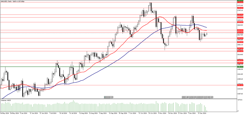 17-18 Aralık tarihindeki Fed toplantından çıkan sonuçların yarattığı negatif eğilimle 2580 dolar desteğine kadar geri çekilen ons altın bu seviyeden gelen tepki alımları ile 2600 dolar seviyesinin üzerinde tutunmayı başardı. Bu hafta Noel rehaveti nedeni ile küresel piyasalarda sakin bir seyir izliyoruz. Ons altın ise 2600 doların üzerinde kalarak güç toplama ve düzeltme sonrası yeniden toparlanma eğiliminde. Panama Kanalı’nın yeniden ABD’ye verilmesini talep edebileceğini söyleyerek tartışmalara neden olan seçilmiş başkan Donald Trump, ABD’nin Panama Büyükelçisi adaylığına Kevin Marino Cabrera’yı gösterdi. Trump’ın Florida’daki seçim ekibinde de görev yapan Cabrera, Miami-Dade Kent Komiseri olarak görev yapıyordu. Bugünün veri ajandasında TSİ 16:30’da açıklanacak ABD haftalık işsizlik başvuruları dışında önemli bir veri bulunmuyor.