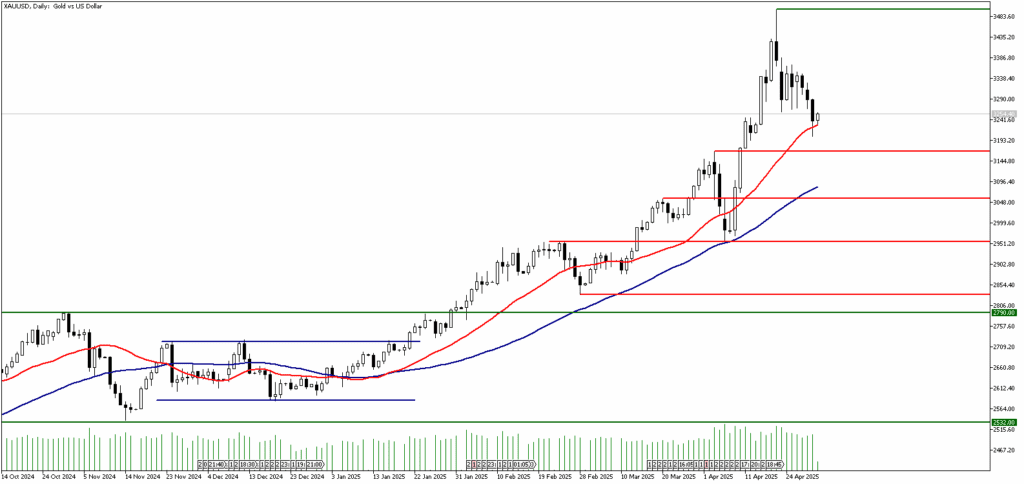 Ons altınında dün yaşanan sert geri çekilme ile 3200 dolar seviyesi test edilirken 3500 zirvesinden gelen düzeltmenin boyu 300 dolara yaklaşmış oldu. Dolar Endeksi (DXY) ise dün yukarı yönlü eğiliminde güç kazanarak 15 Nisan tarihinden bu yana ilk kez 100 seviyesinin üzerini gördü. Dolar Endeksi için 22 günlük hareketli ortalamanın bulunduğu 100.34 seviyesi direnç olarak karşımıza çıkıyor. Dolar Endeksinde bu direncin aşılması halinde ons altındaki satış baskısı artabilir.